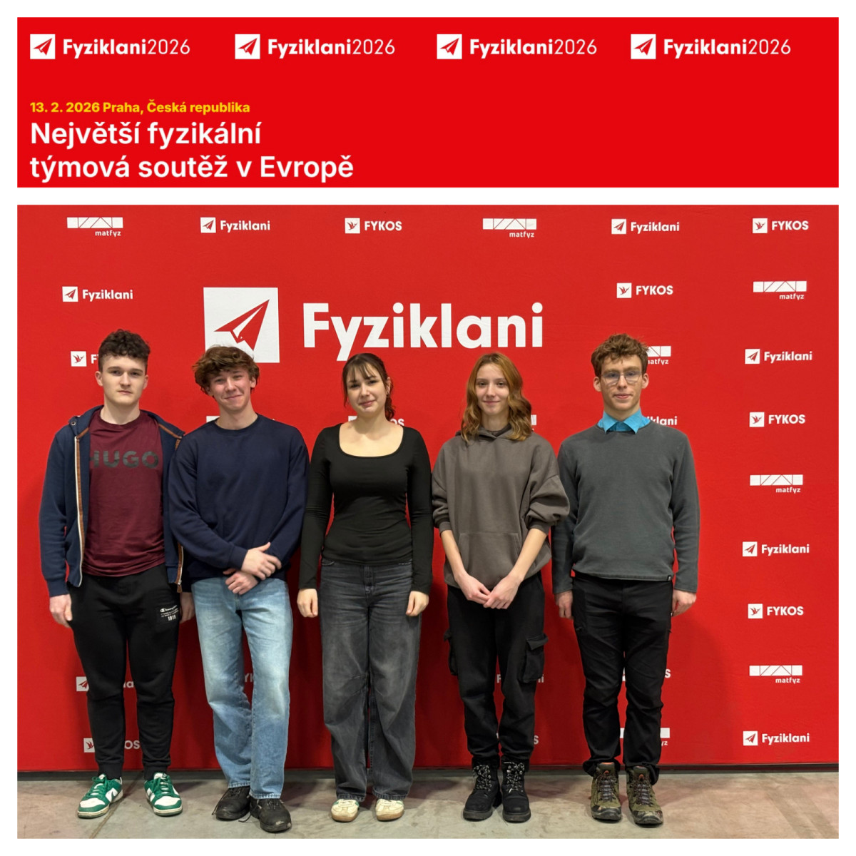 V pátek 13. 2. 2026 se pětice septimánů (Š. Bahr, M. Hrubá, J. Kubica, J. Pazdírková a M. Trefil) vydala do Prahy na mezinárodní týmovou soutěž Fyziklání. Účast si studenti zorganizovali sami – od přihlášení až po přípravu – a školu reprezentovali z vlastní iniciativy a nadšení pro fyziku.