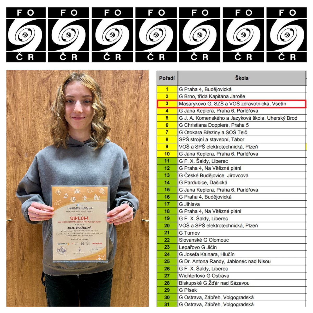 Celostátní kolo se uskutečnilo ve dnech 3.– 6. února 2026 v Olomouci, kde se utkalo 40 nejlepších mladých fyziků z celé České republiky. Julie zde dosáhla naprosto fantastického výsledku – obsadila vynikající 3. místo a zároveň byla vyhlášena nejlepší řešitelkou experimentální úlohy. Jedná se o obrovský úspěch, z něhož máme všichni upřímnou radost a který s Julií s nadšením sdílíme.