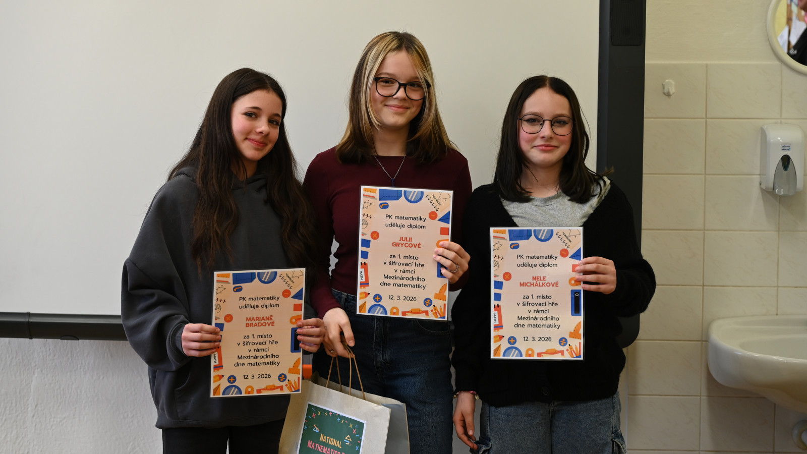 V rámci oslav tohoto dne se na naší škole konalo několik akcí. Ve čtvrtek 12. března proběhla šifrovací hra pro naše primánky. Principem hry bylo luštění šifer a hlavolamů, které účastníky vedly z jednoho stanoviště na další. Hra byla nejen zábavná a vzdělávací, ale také napínavá až do posledního úkolu. Nejlépe si se stezkou po škole poradilo dívčí družstvo ve složení Mariana Bradová, Julie Grycová a Nela Michálková.