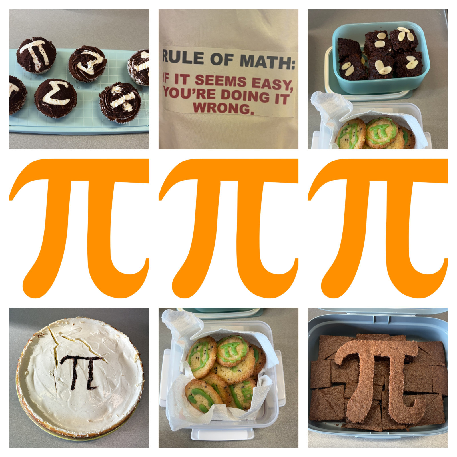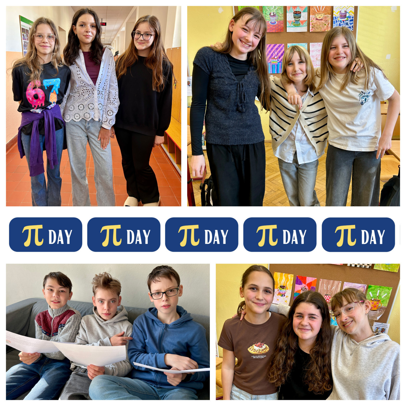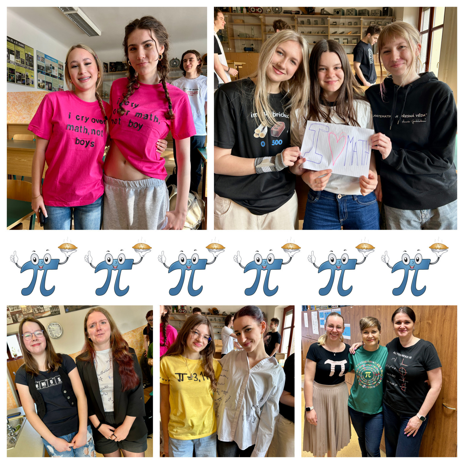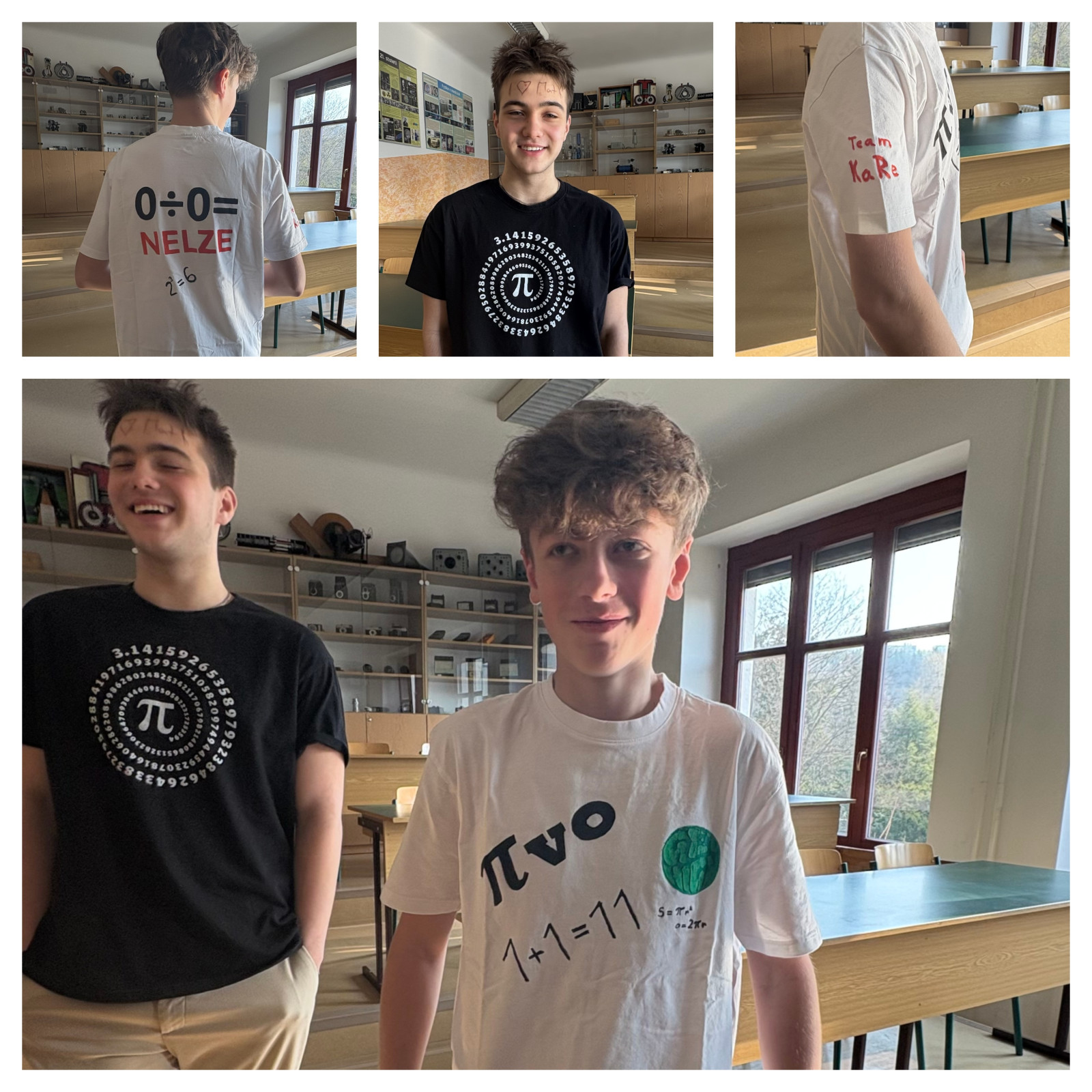 Další aktivitou bylo společné focení v matematických outfitech. Účastníci se oblékli do oblečení s matematickými motivy, jako jsou trička se vzory rovnic, symbolů či grafů. Kromě toho jsme si mohli pochutnat na dobrotách s matematickou tematikou – koláčích, pernících či cupcacích se symbolem π a geometrickými tvary. Tato aktivita podpořila nejen kreativitu, ale i týmového ducha, zejména ve třídě 1.B. :)