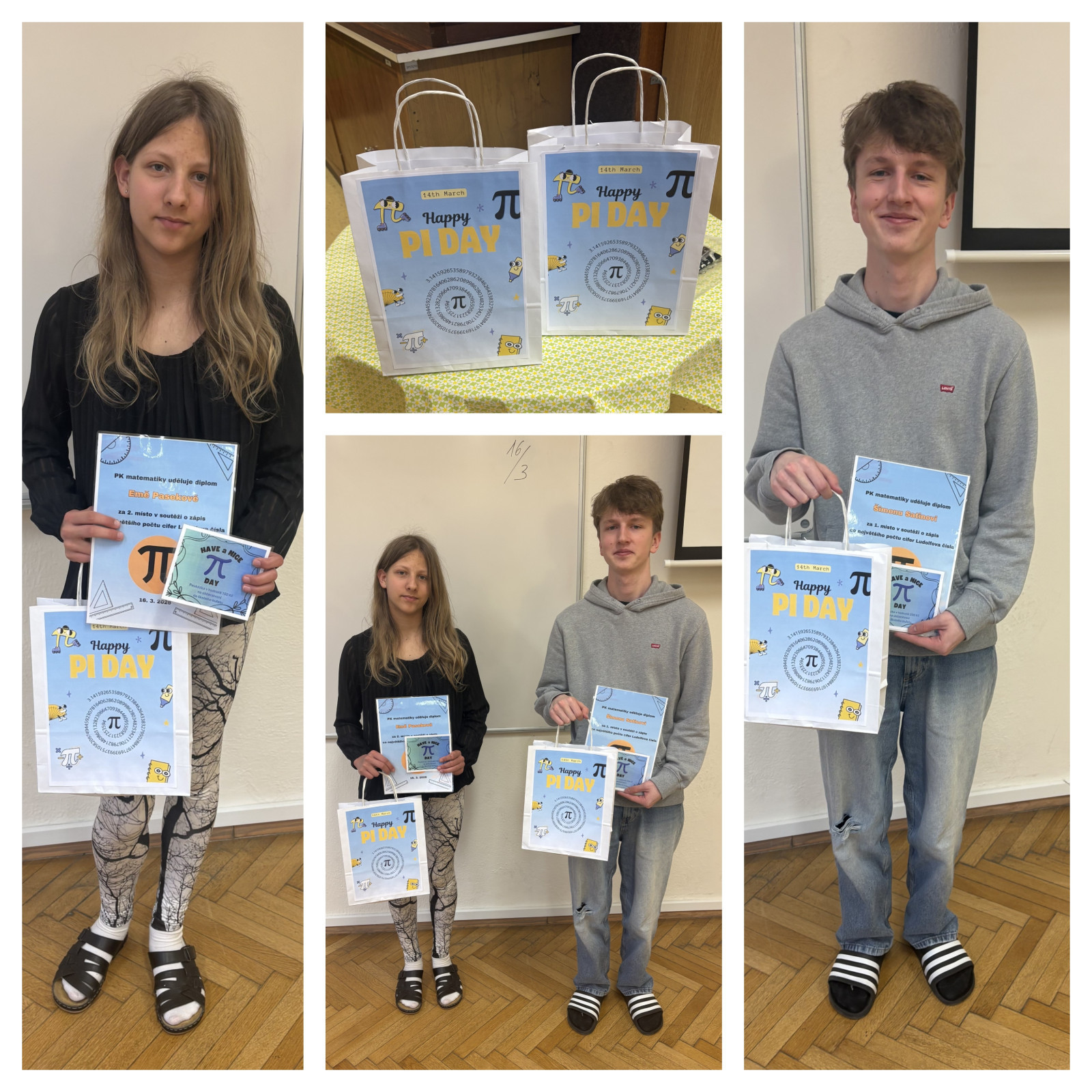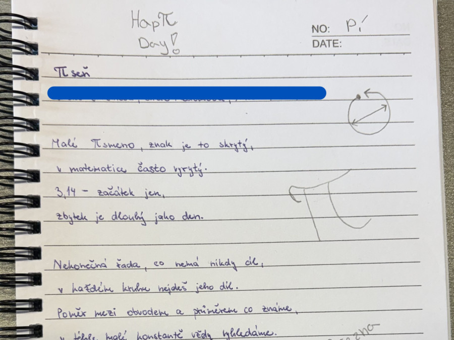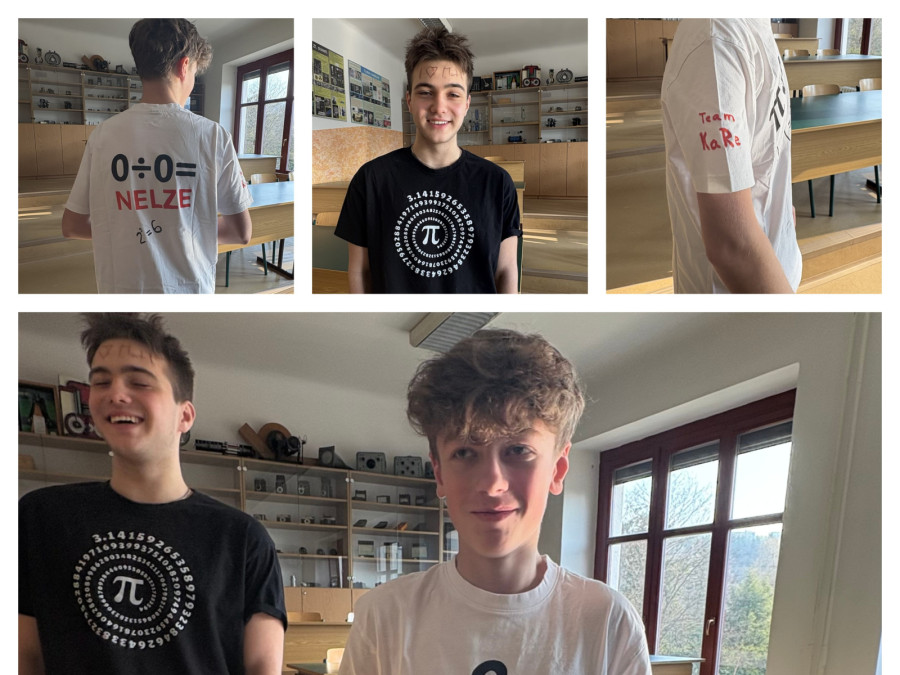 V pondělí 16. března se studenti mohli zúčastnit soutěže v zápisu cifer čísla π. Úkolem soutěžících bylo zapsat správně co největší počet číslic Ludolfova čísla. Nejlepší výkon předvedl Šimon Satin (2.C), který zapsal neuvěřitelných 1232 cifer. Výborný výkon podala také Ema Paseková (4.AV), která si zapamatovala 261 číslic.