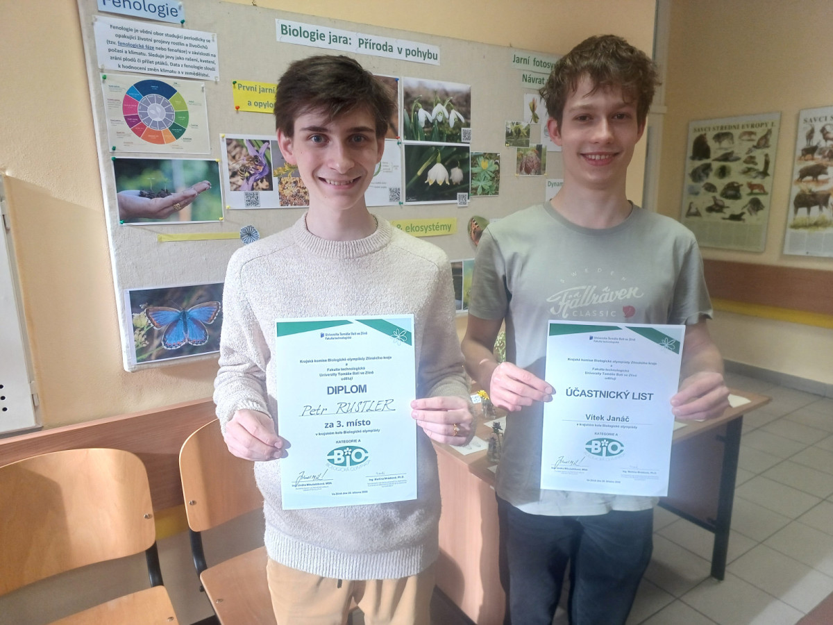 V pátek 20. 3. 2026 proběhlo na UTB ve Zlíně krajské kolo Biologické olympiády kategorie A, ve kterém nás reprezentovali studenti čtvrtého ročníku Petr Rustler a Vítek Janáč. Z celkového počtu 28 účastníků obsadili třetí a sedmé místo. Gratulujeme a přejeme oběma mnoho úspěchů při studiu medicíny.