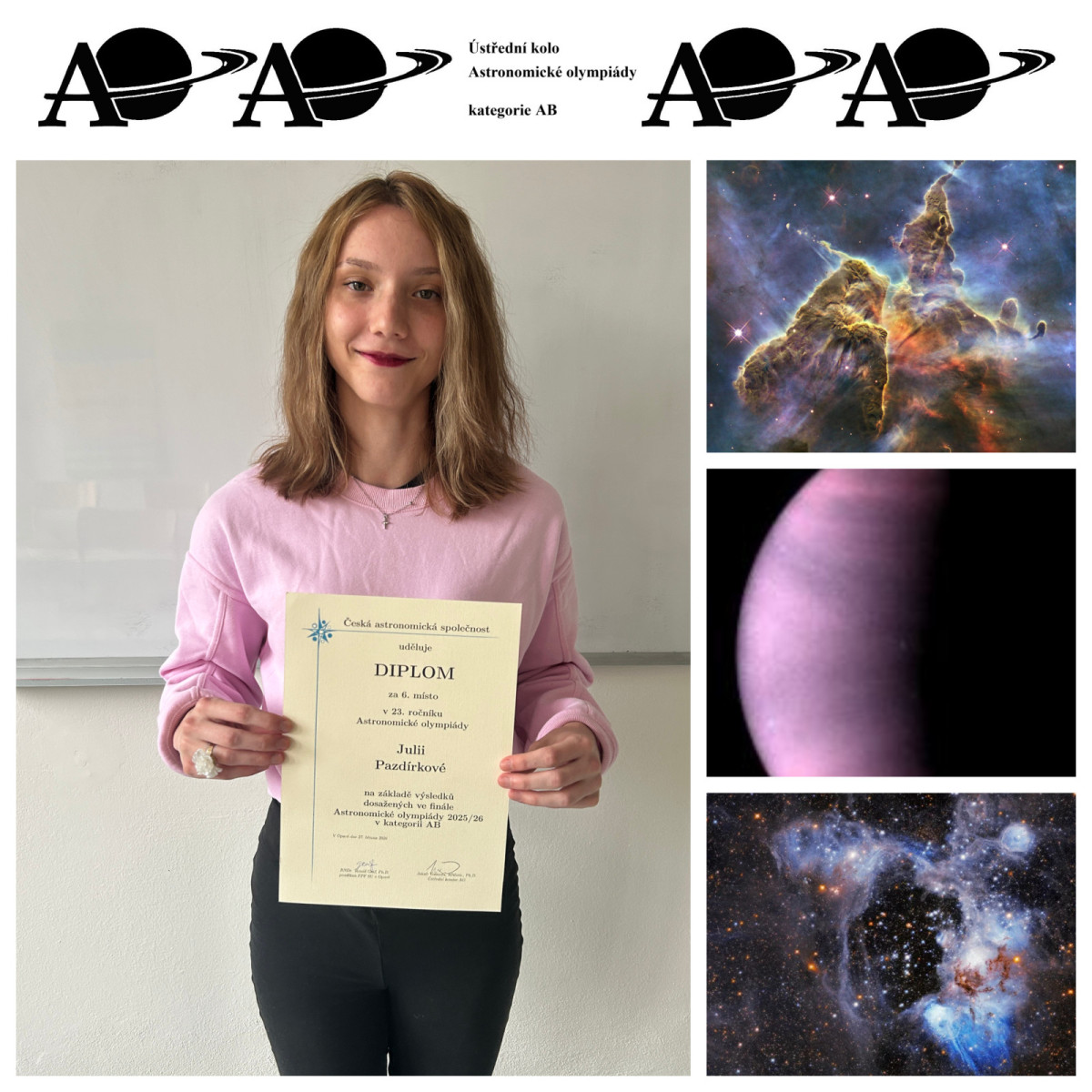 Pro Julii to byl již opětovný postup do ústředního kola v Opavě – úspěšně se ho účastnila také v loňském roce. A ani letos nezklamala: v konkurenci nejlepších mladých astronomů z celé České republiky se umístila na skvělém šestém místě v republice. Nejlepší student z úspěšných řešitelů ústředního kola navíc budou vybráni na výběrové soustředění, ze kterého se vybírají reprezentanti pro Mezinárodní olympiádu v astronomii a astrofyzice.