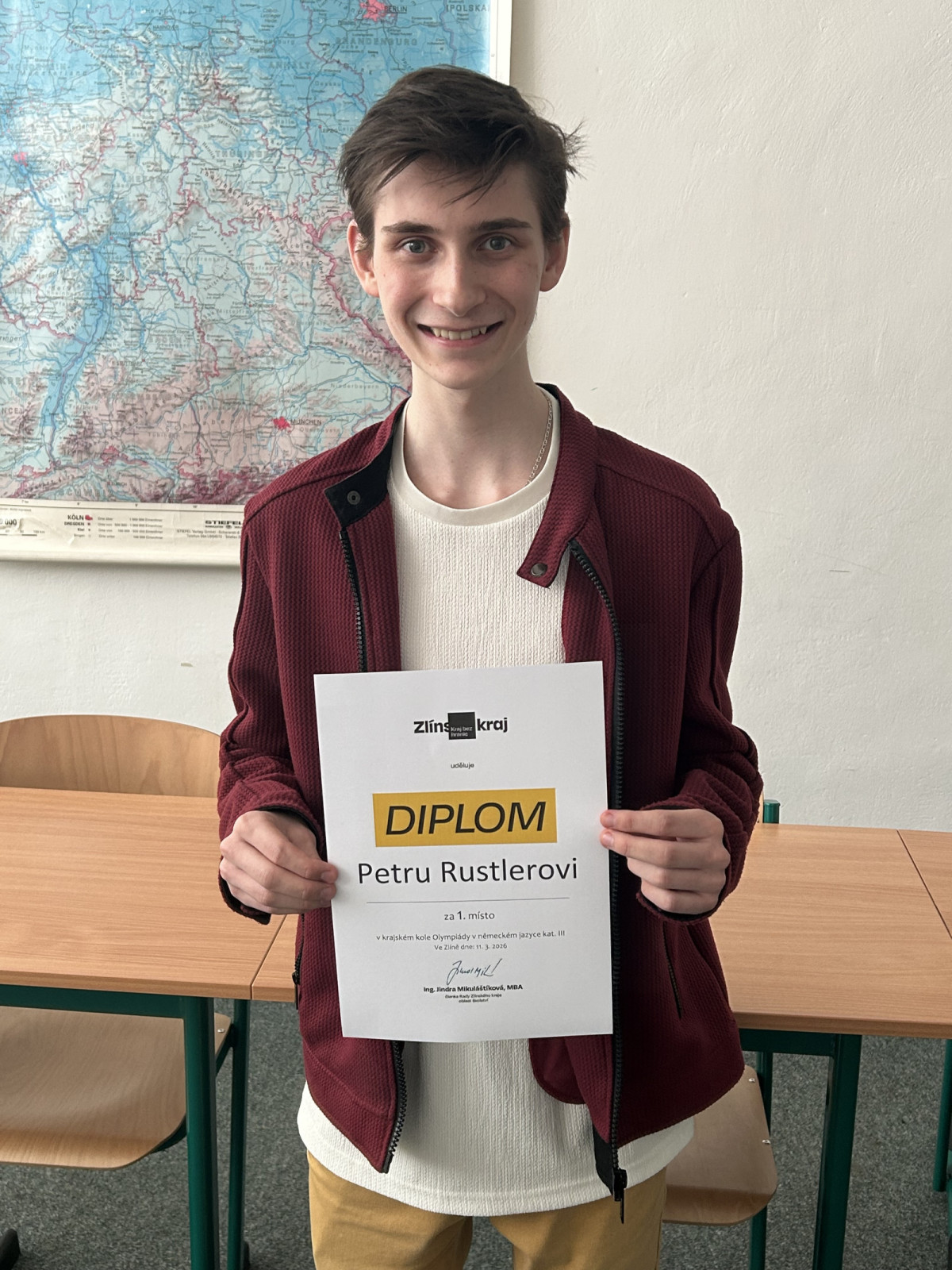 Student třídy 4.B Petr Rustler reprezentuje naši školu v Olympiádě z německého jazyka po celou dobu svého studia. Po mnoha sériích třetích a čtvrtých míst v okresních a krajských kolech dosáhl Petr mimořádného úspěchu a v letošním ročníku olympiády zvítězil jak v kole okresním ve Val. Meziříčí, tak také v kole krajském ve Zlíně a vybojoval si postup do celostátního kola. Celostátní kolo se bude konat v Goethe-Institutu v Praze ve dne 19. - 22. 4. 2026.