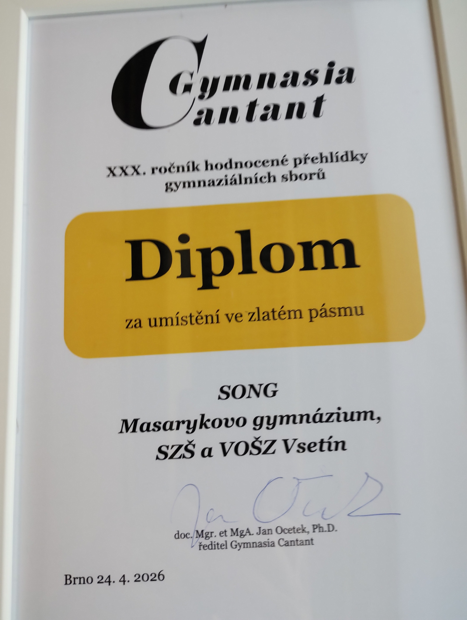 Letos se konal už 30. ročník soutěže gymnaziálních pěveckých sborů Gymnasia cantant. Z regionálních kol se do celostátního kola v Brně probojovalo 14 sborů z celé republiky. Na 500 zpěváků se ubytovalo v Gymnáziu Brno, Vídeňská. Tři dny společného setkávání a zpívání v různých sálech byly velmi intenzívní. Soutěž probíhala v Konventu milosrdných bratří a hodnotila ji pětičlenná porota. Úroveň soutěžních vystoupení byla opravdu vysoká, proto při vyhlašování výsledků vládlo zřetelné napětí. Podaří se Songu obhájit zlaté pásmo z minulých let? Napětí stoupá, před námi vyhlásili 3 sbory v bronzovém pásmu, 7 sborů ve stříbrném pásmu ...Ano, podařilo se. Velká radost a nadšení zavládly ve sboru, když president soutěže doc. Mgr. MgA. Jan Ocetek předával diplom sbormistryní Heleně Kaločové. Práce a soustředění na výkon se vyplatily.
