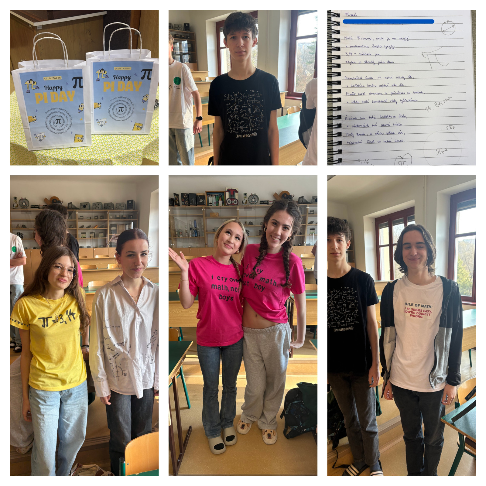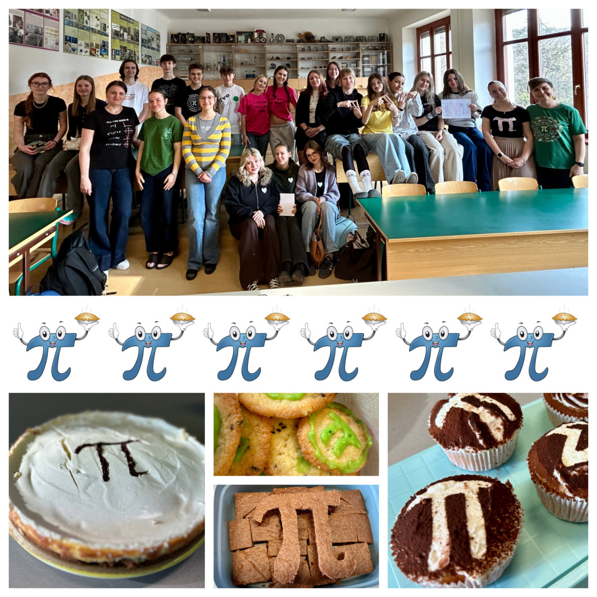 Další aktivitou bylo společné focení v matematických outfitech. Účastníci se oblékli do oblečení s matematickými motivy, jako jsou trička se vzory rovnic, symbolů či grafů. Kromě toho jsme si mohli pochutnat na dobrotách s matematickou tematikou – koláčích, pernících či cupcacích se symbolem π a geometrickými tvary. Tato aktivita podpořila nejen kreativitu, ale i týmového ducha, zejména ve třídě 1.B. :)
