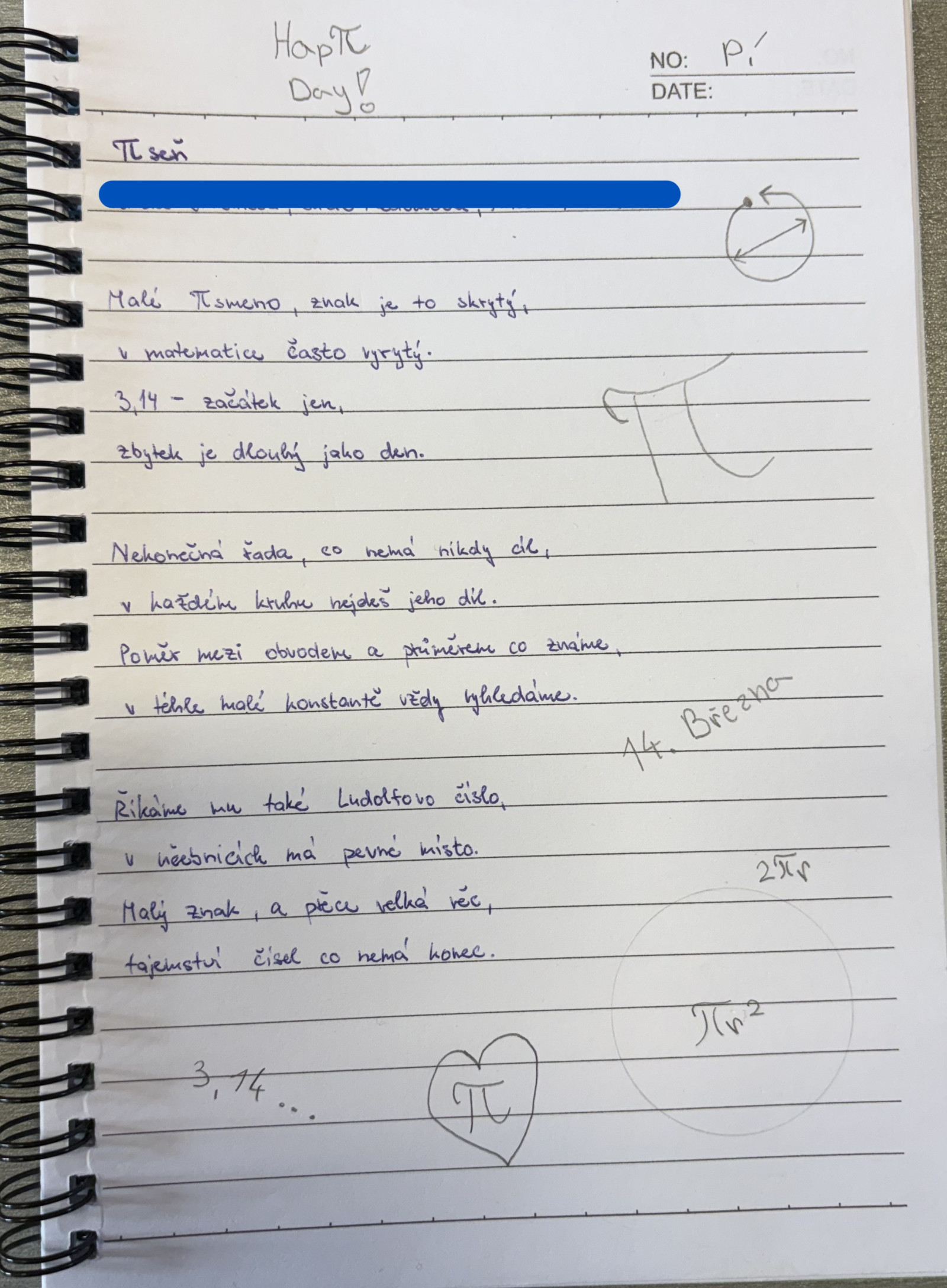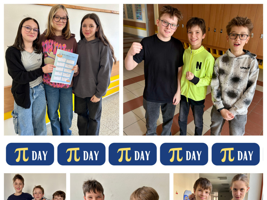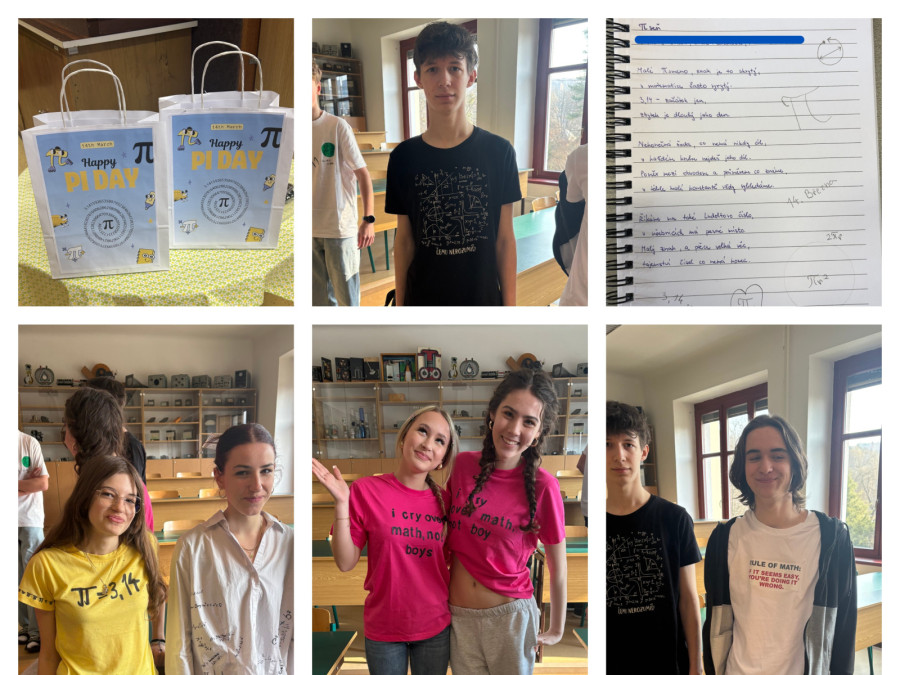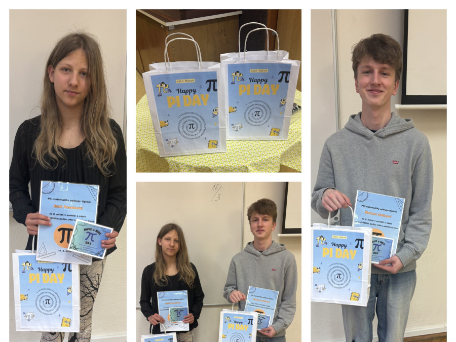 V pondělí 16. března se studenti mohli zúčastnit soutěže v zápisu cifer čísla π. Úkolem soutěžících bylo zapsat správně co největší počet číslic Ludolfova čísla. Nejlepší výkon předvedl Šimon Satin (2.C), který zapsal neuvěřitelných 1232 cifer. Výborný výkon podala také Ema Paseková (4.AV), která si zapamatovala 261 číslic.